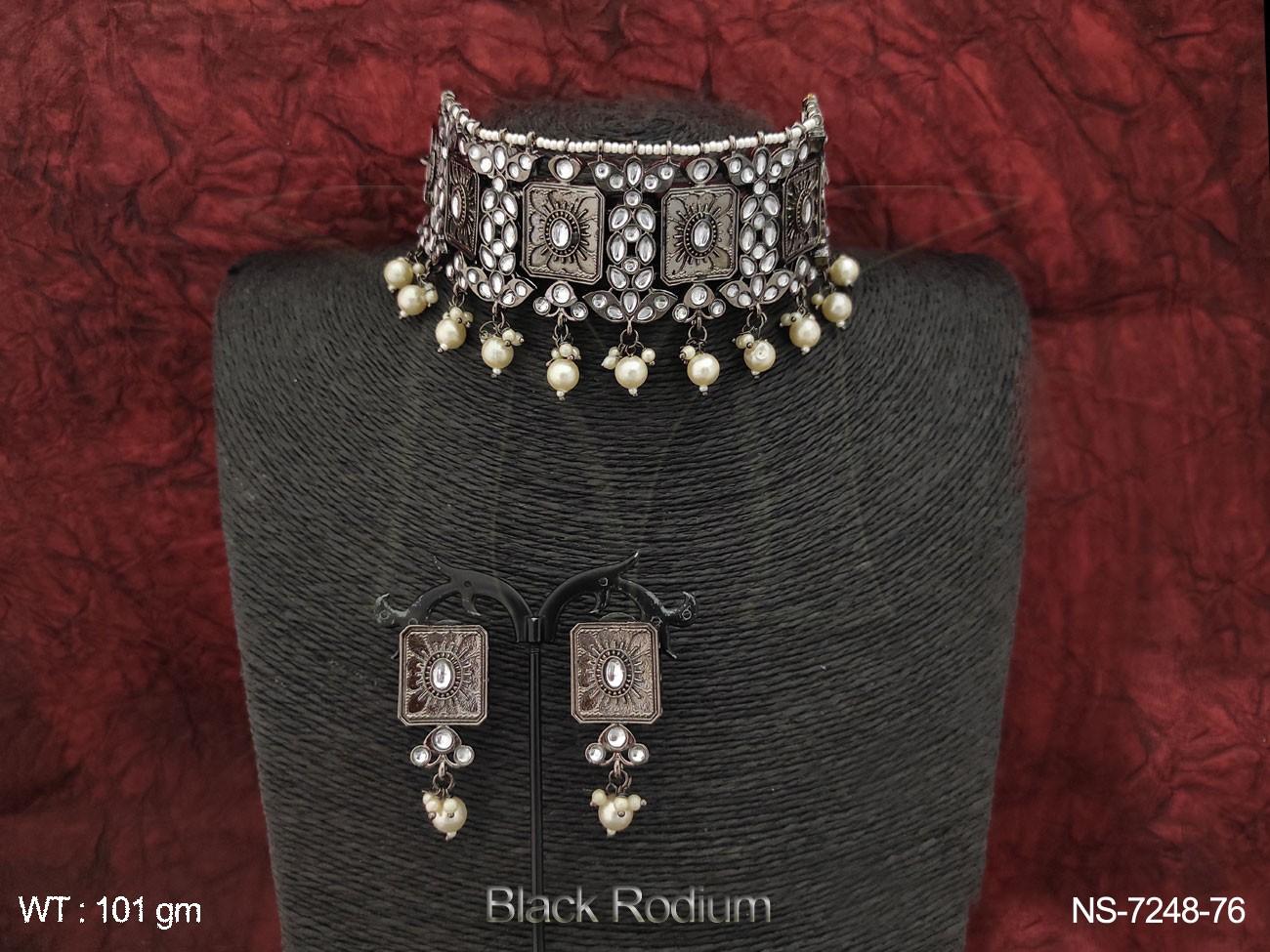 - Beautiful Designer Stylish Fancy full white Stones Black Rodium Kundan Necklace Set