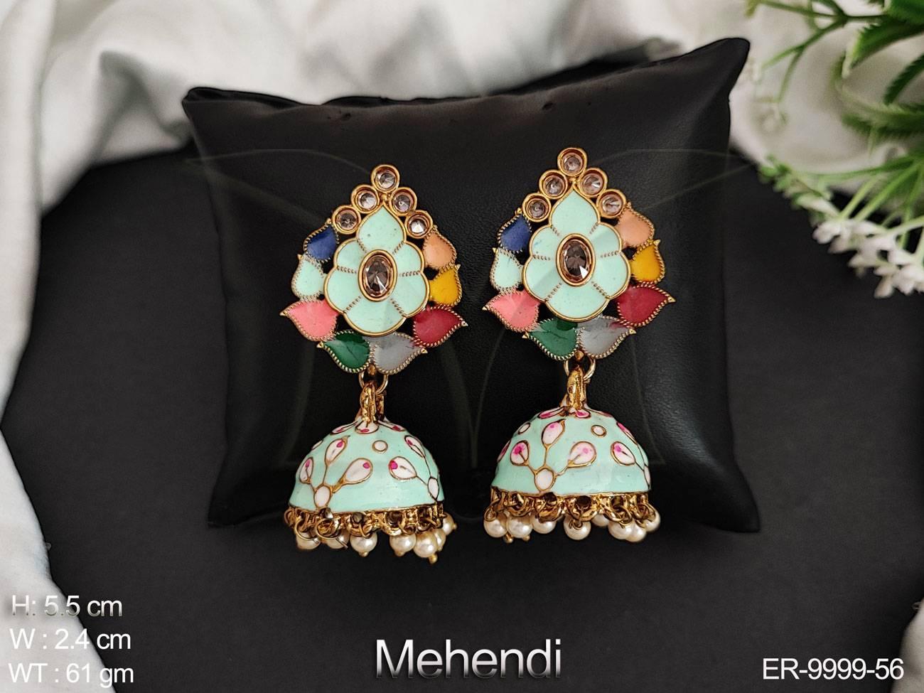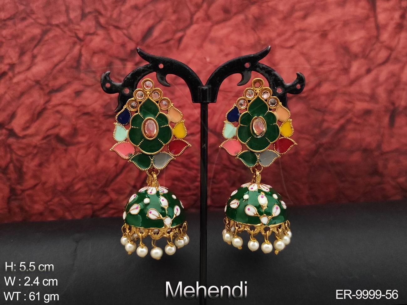 2. Beautiful Party wear Mehendi Polish Meenakari Design Jhumka Earring