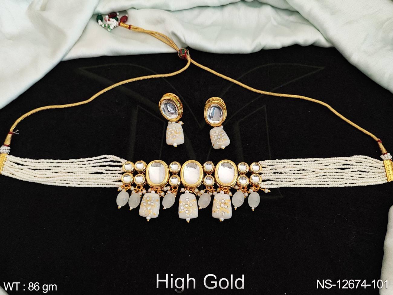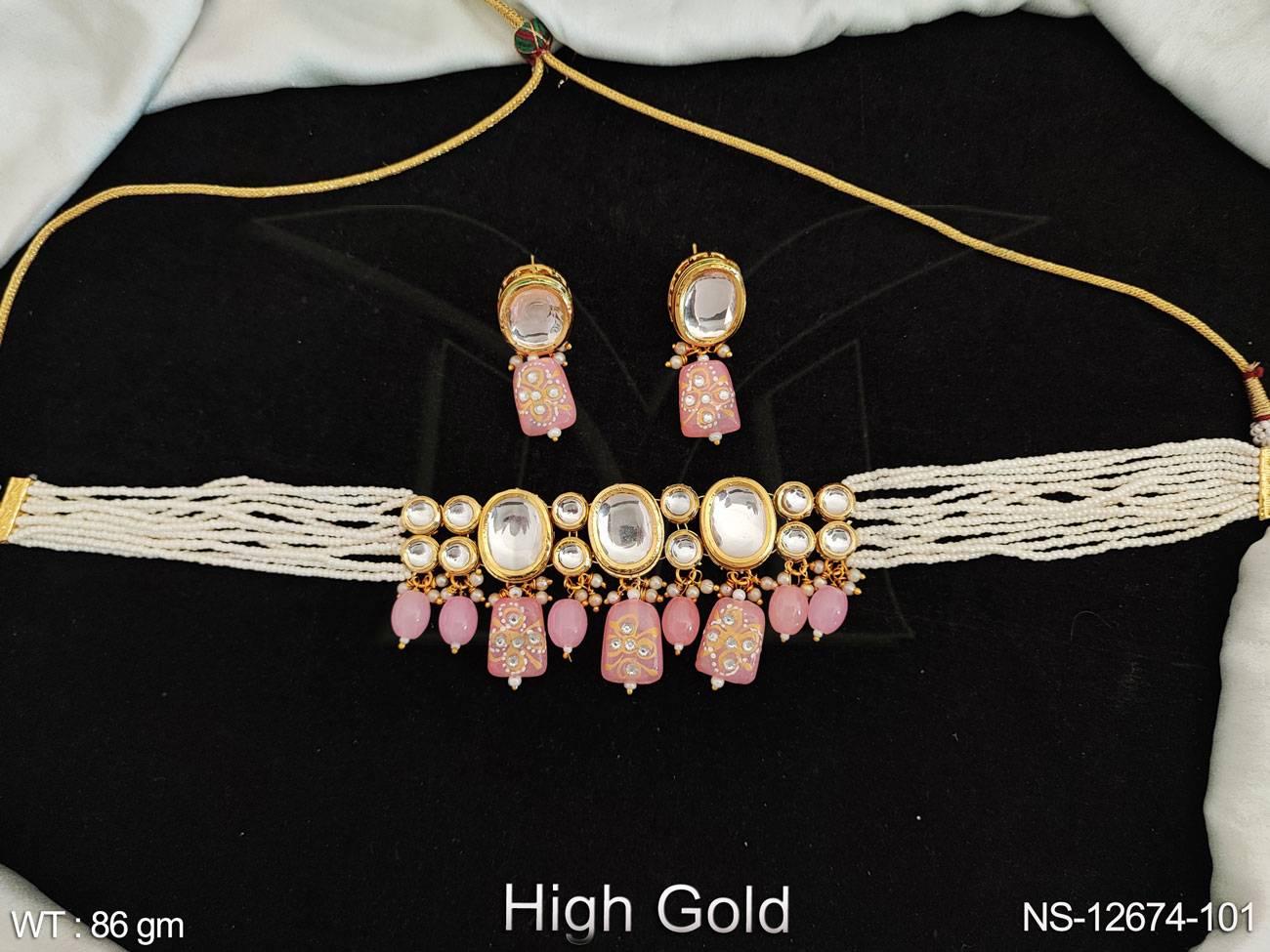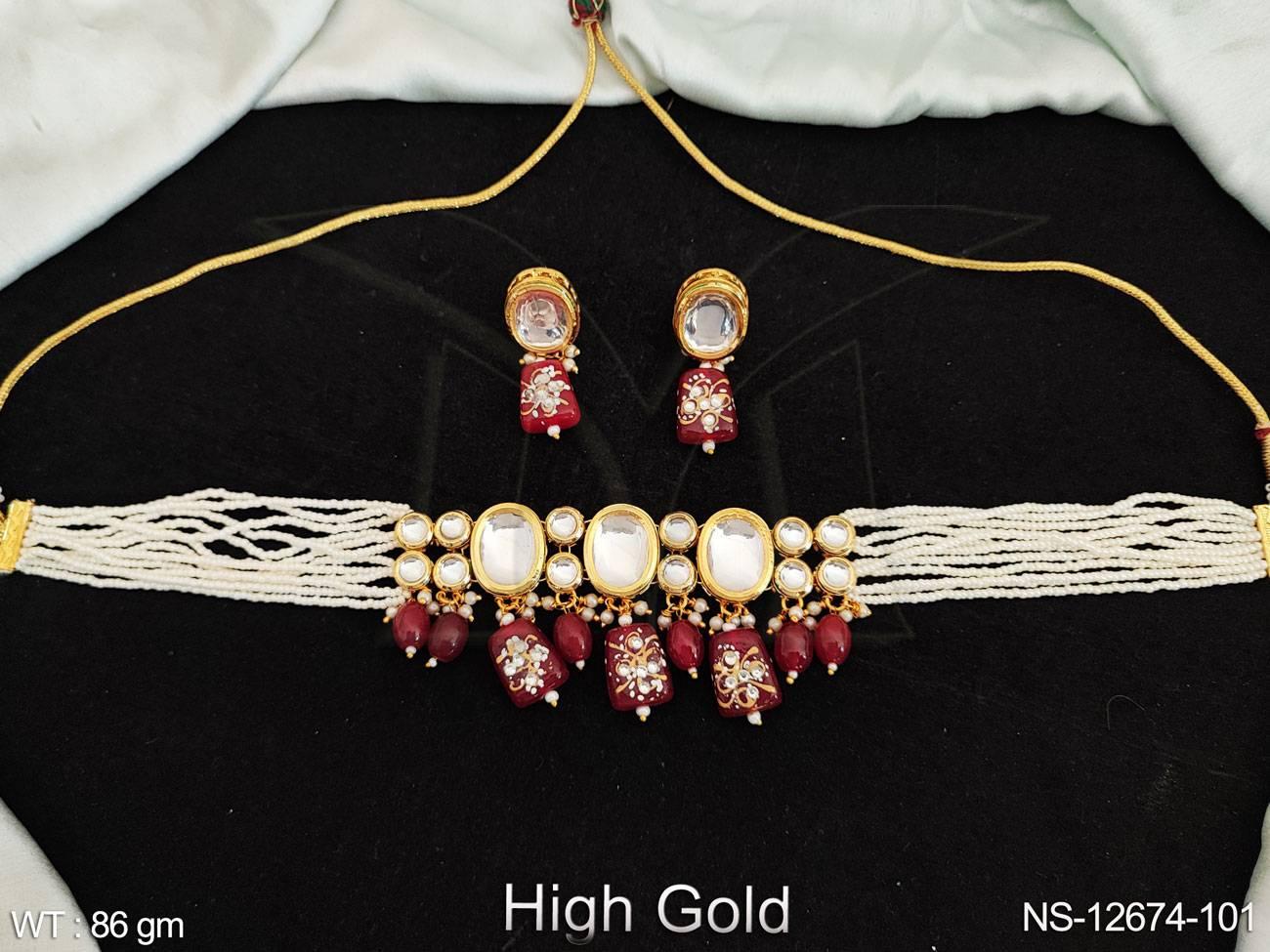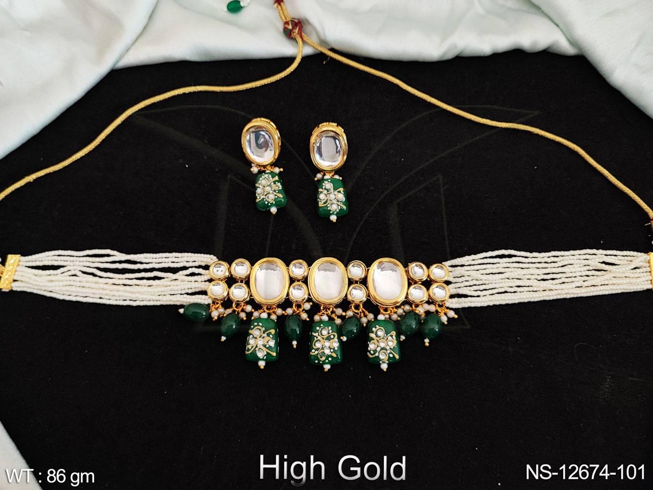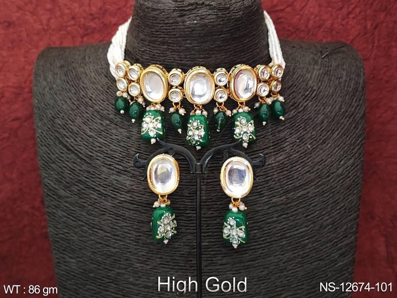2. Meenakari Clustered Pearl Desinger Fancy Style High Gold Polish Kundan Necklace Set