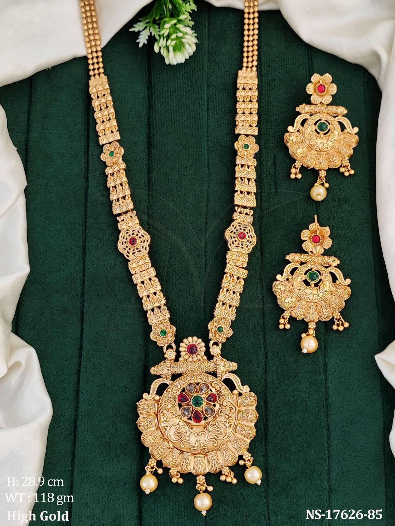 Antique Long Necklace Set with Kemp Stones & Pearls High Gold Finish