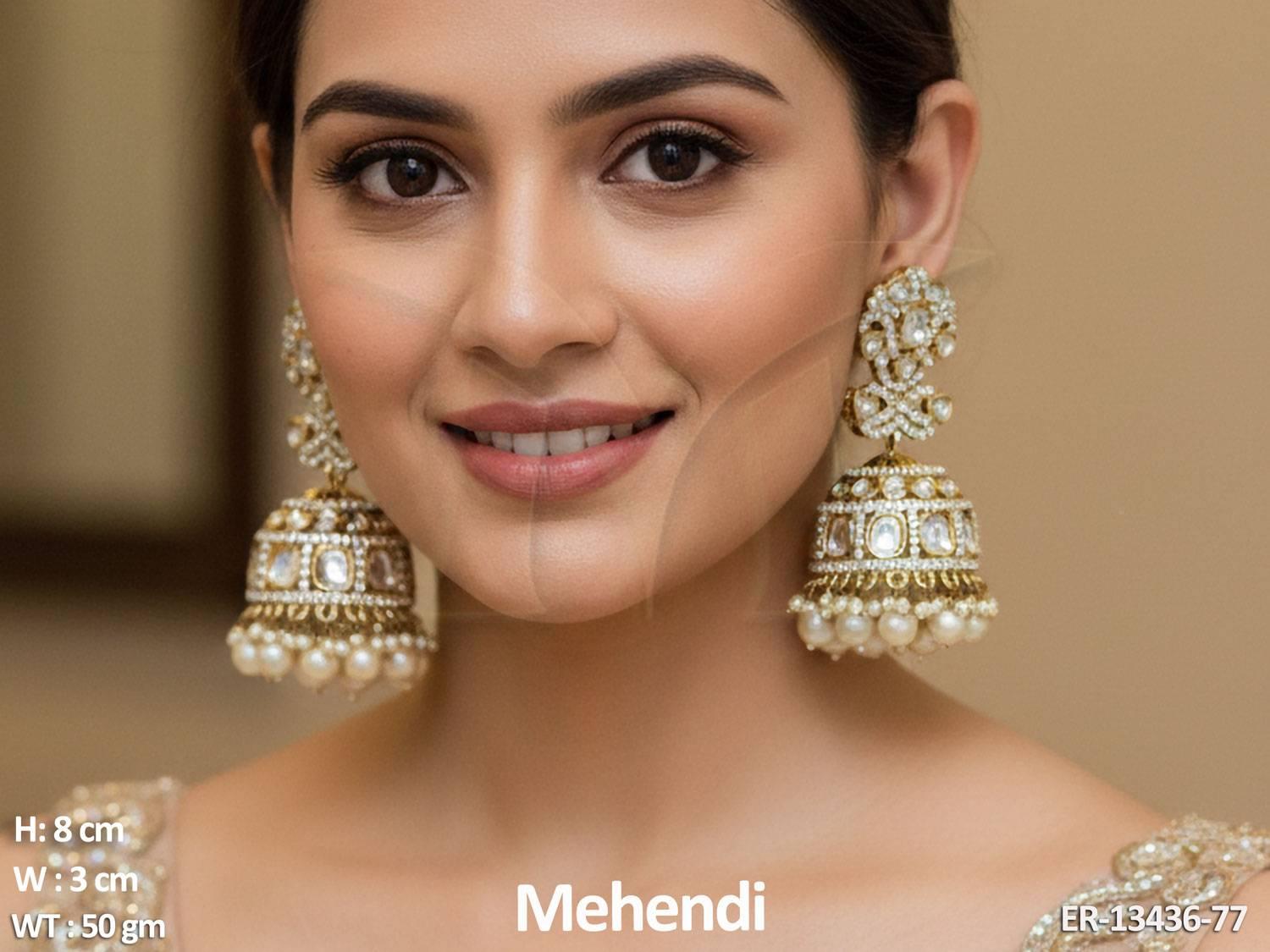 - Clustered Pearl Kundan Stones Mehendi Polish Beautiful Kundan Jewellery Kundan Jhumka Earring
