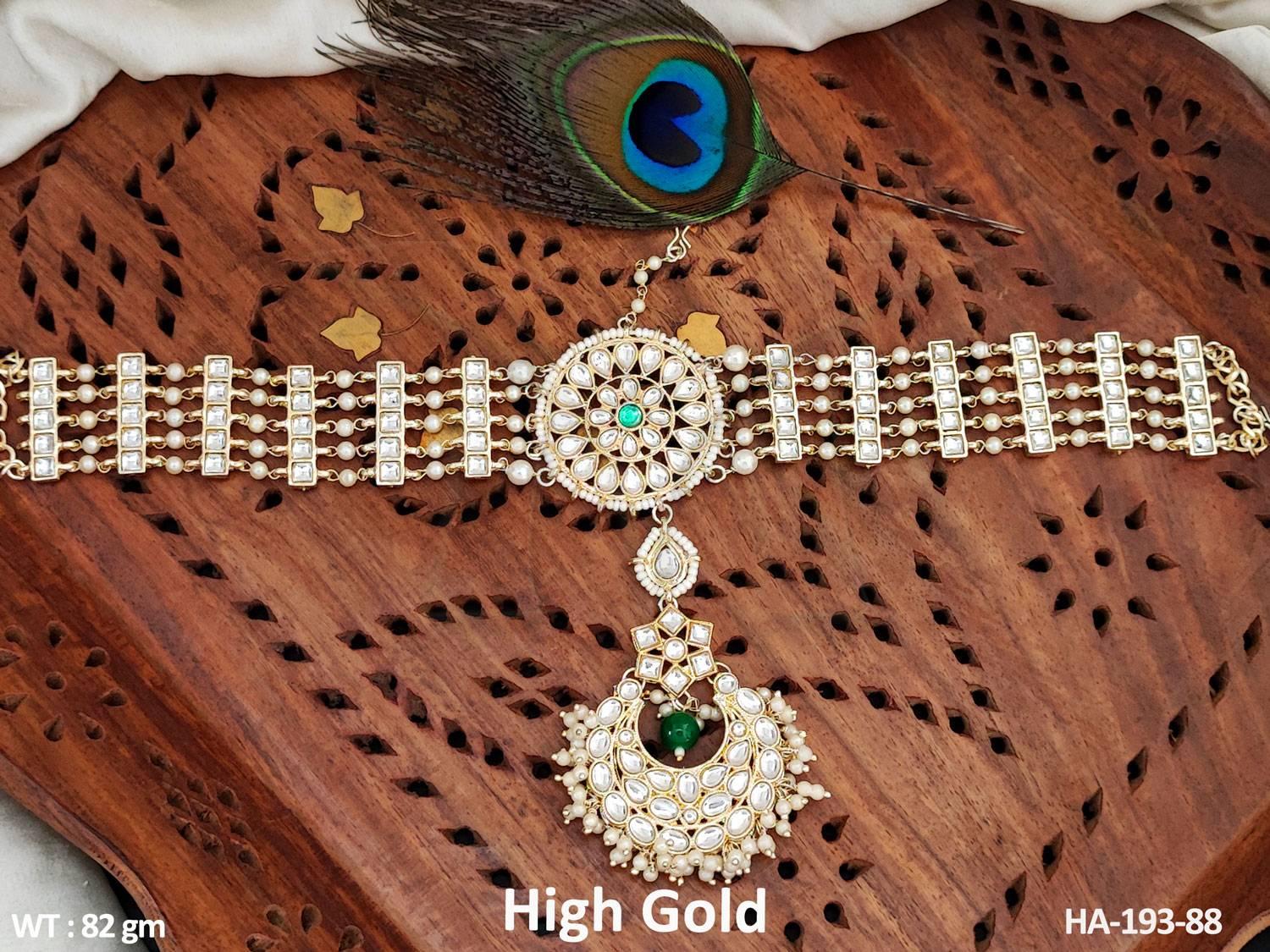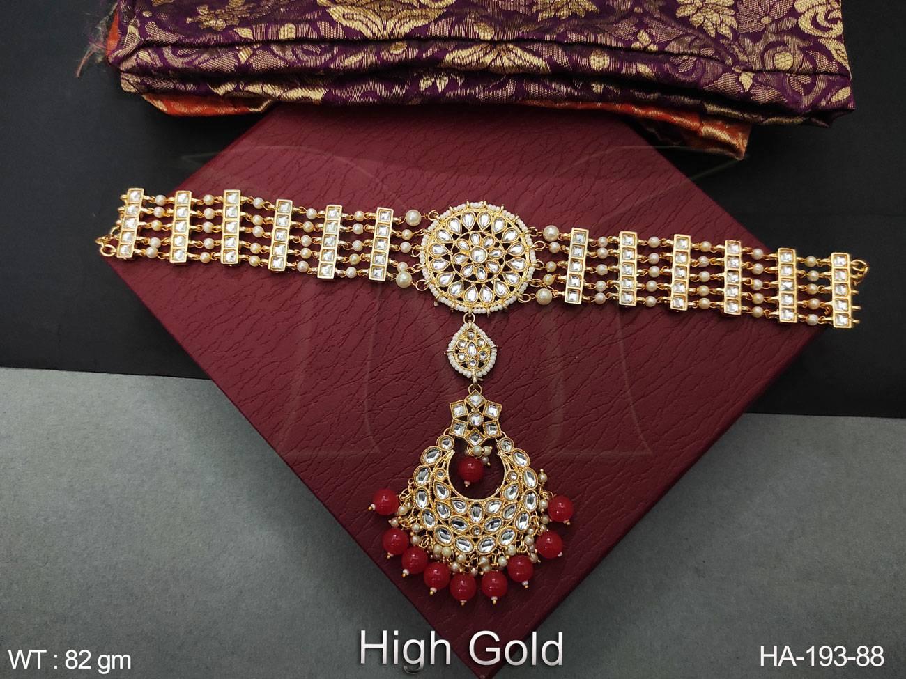 - Designer Fancy Design High Gold Polish Party wear Kundan Hair Accessories Jewellery Kundan Matha Patti