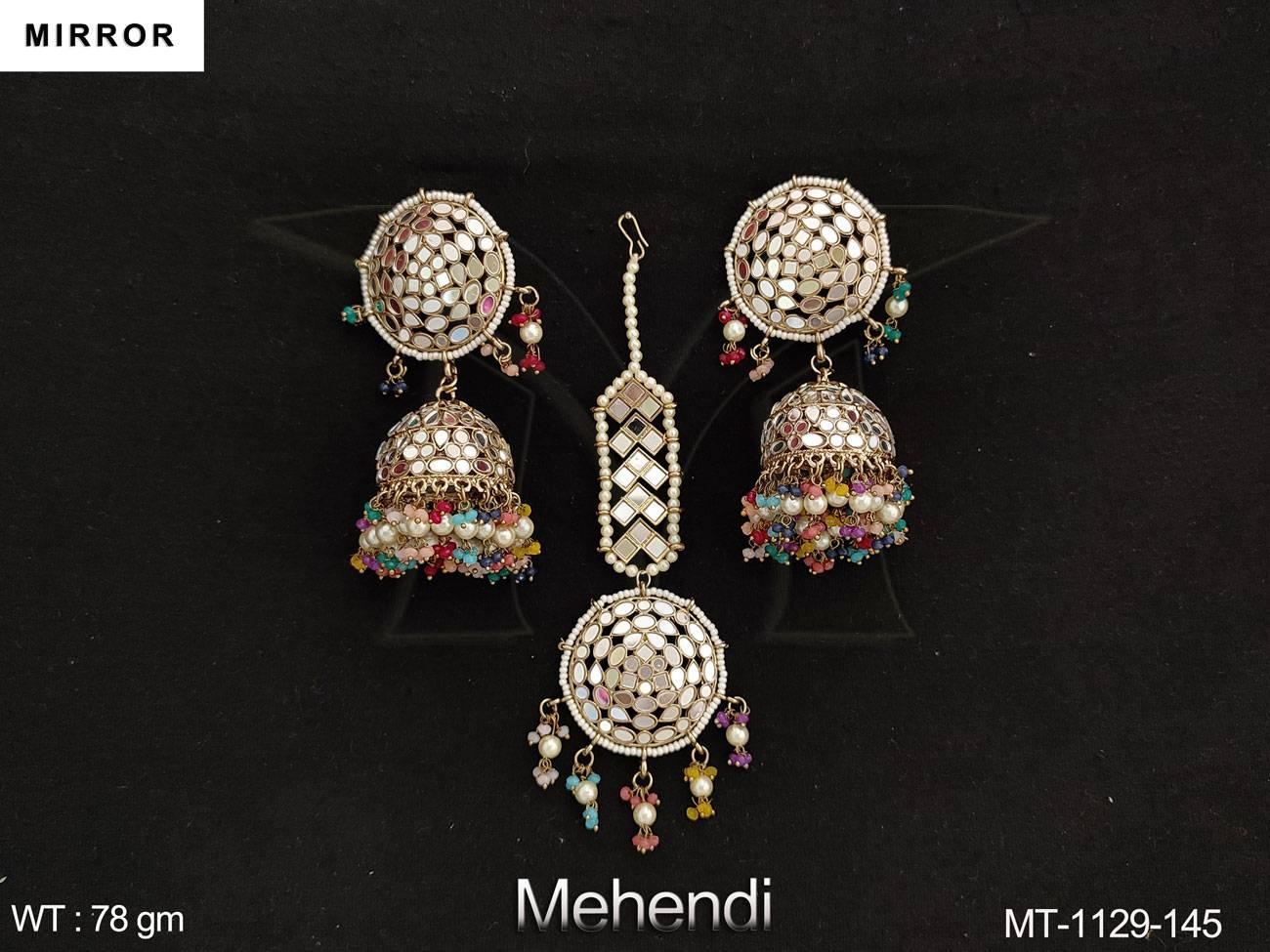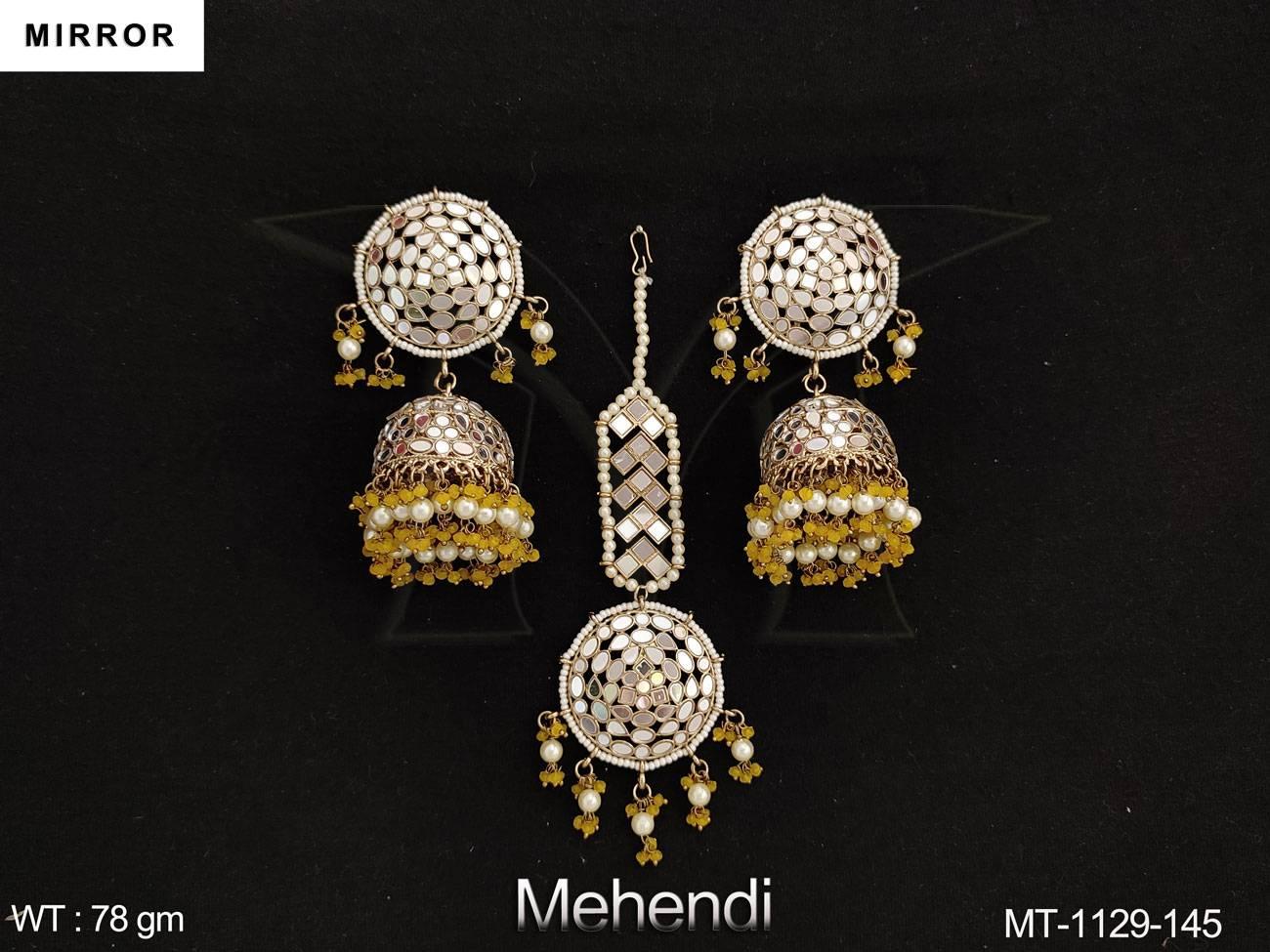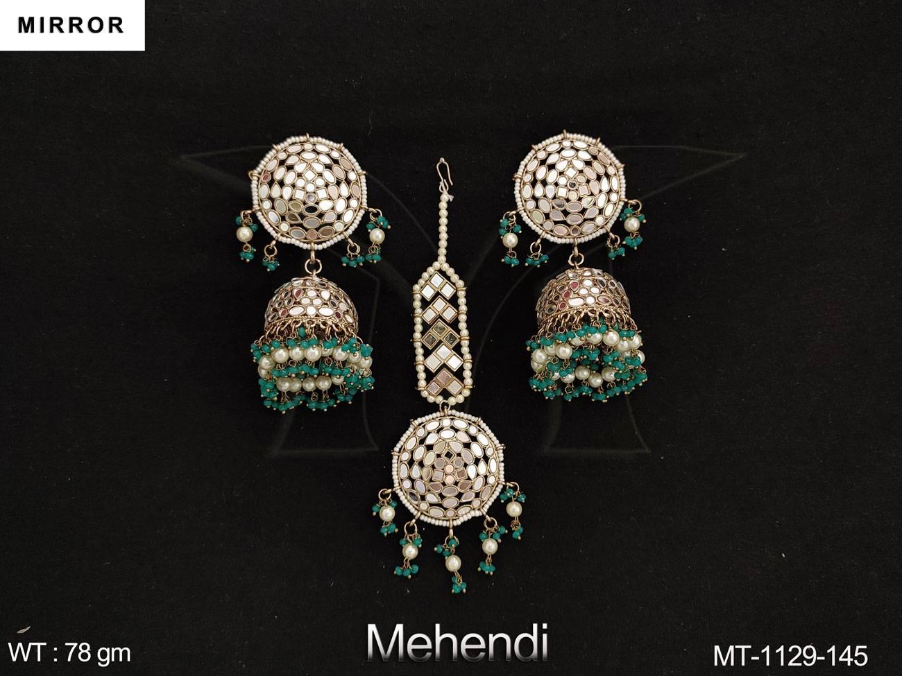 - Designer Mehendi Polish Party wear Mirror Work Maang Tikka with Earring
