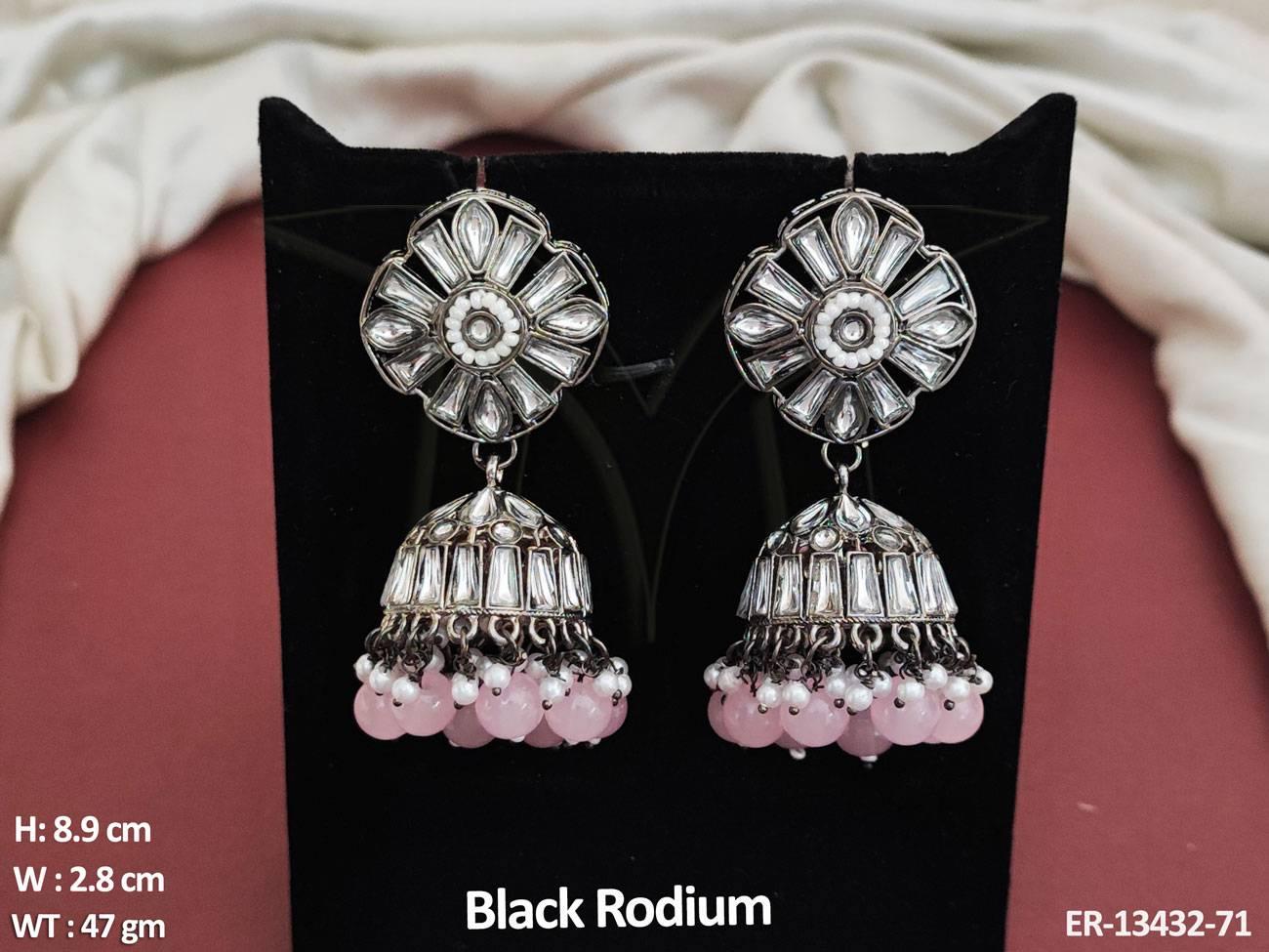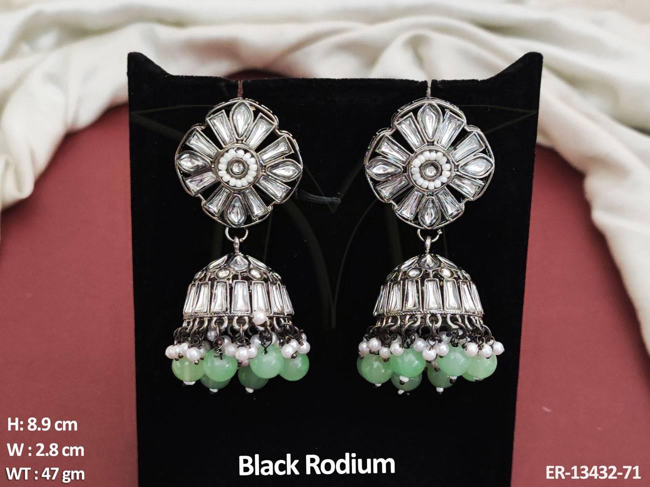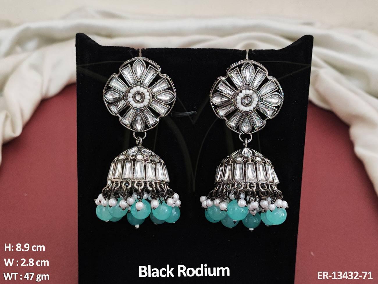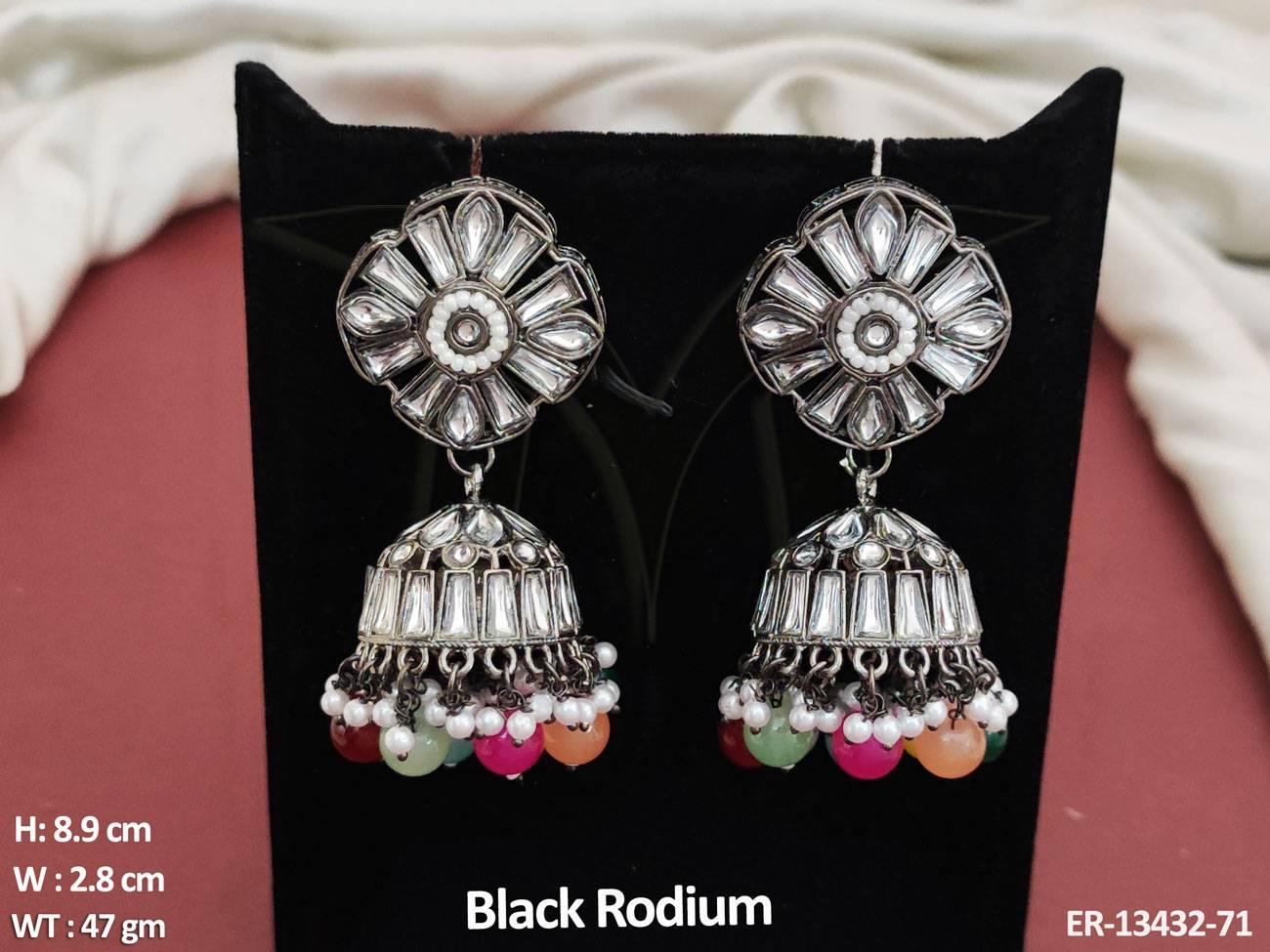 - Designer party wear black rodium polish fancy style kundan jhumka earrings