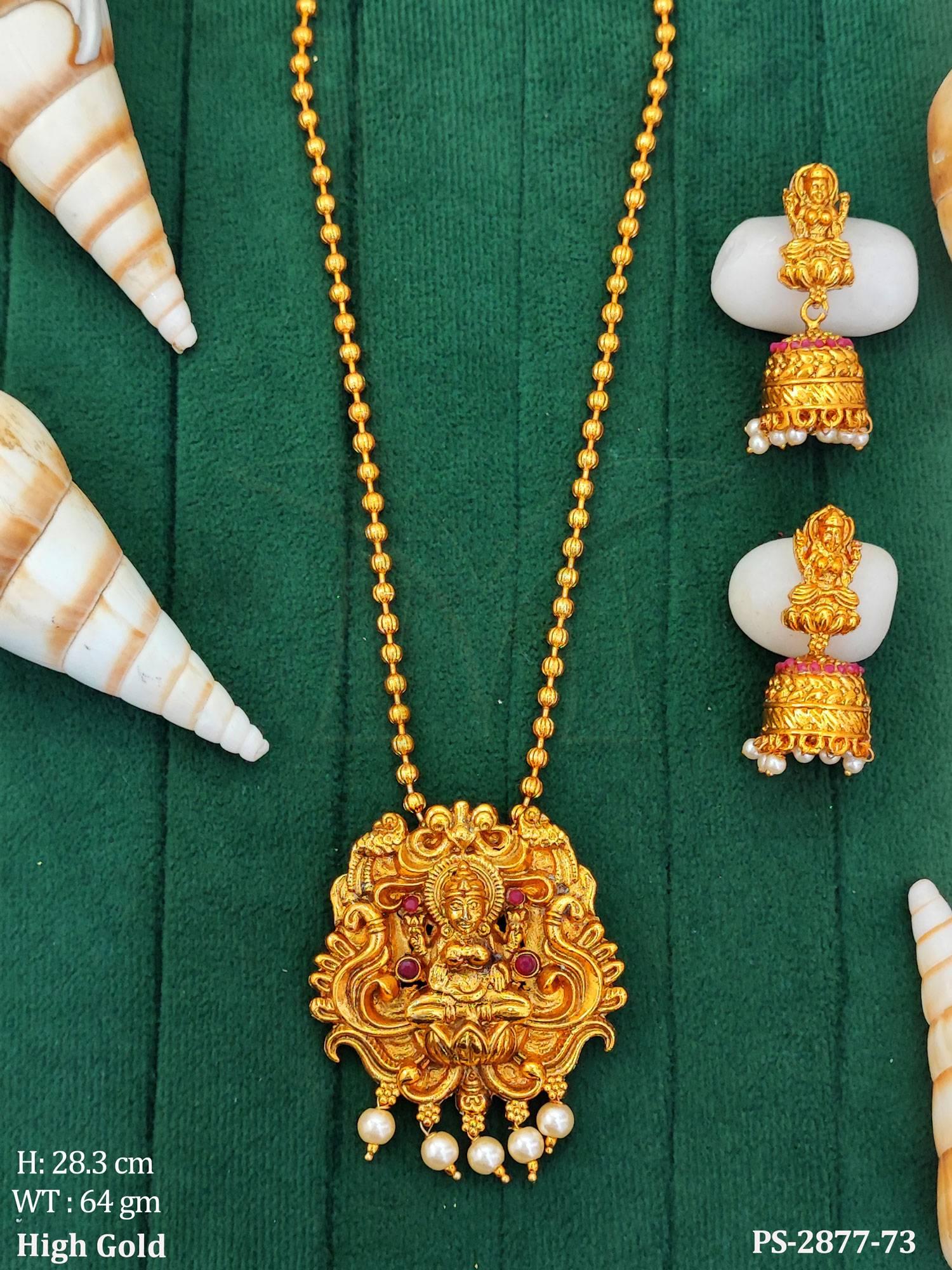 - Fancy Desing High Gold Polish Clustered Pearl God Laxmi Pendnat Temple Jewellery Temple Long Pendant Set