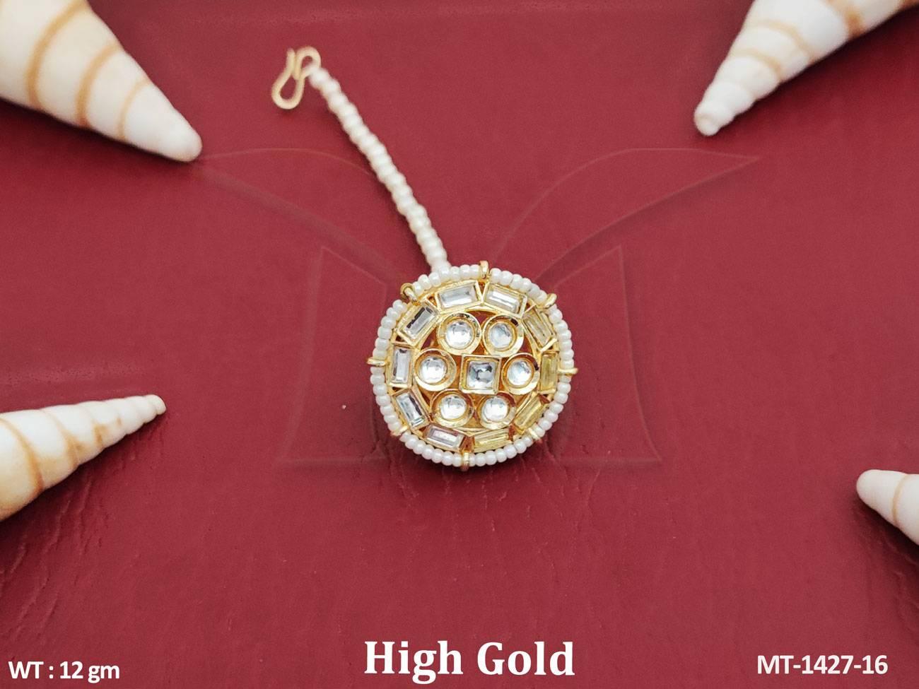 - Fancy Style Clustered Pearl High Gold Polish Kundan Stones Kundan Jewellery Designer Maang Tikka