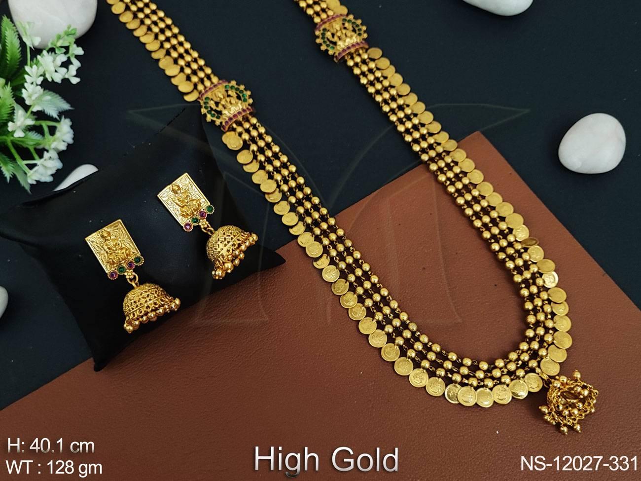- Laxmi Desing High Godl Polsih fancy Style Long Temple Jewllery Coin Necklace Set