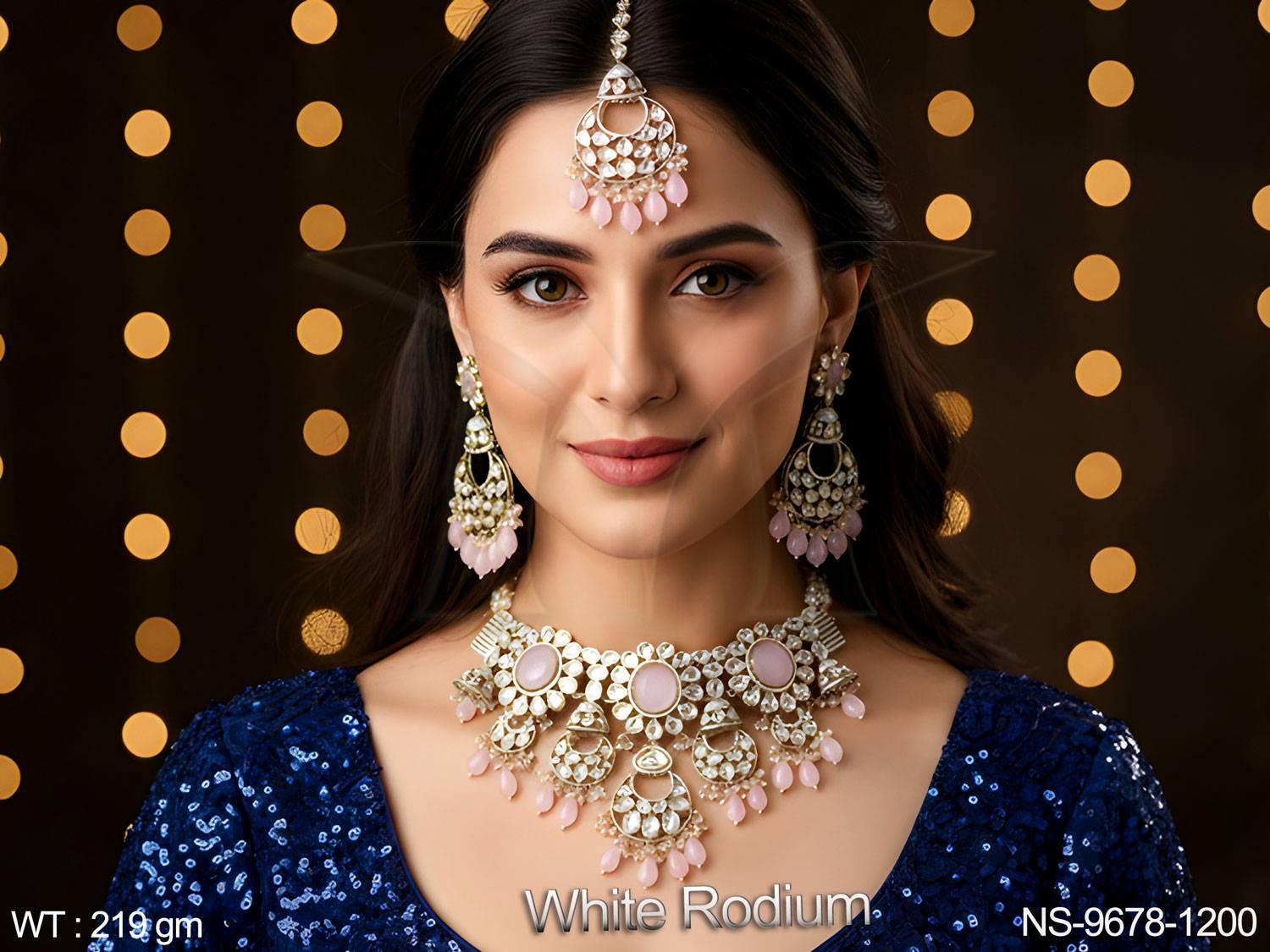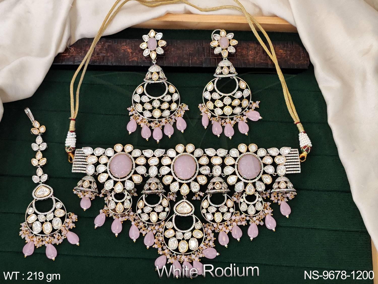 White Rodium Polish Designer Full Kundan White Stones Party wear Beautiful Fusion Choker Necklace Set